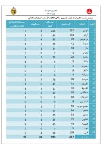 Le nombre de décès en Tunisie s’est, également, stabilisé à 49 selon le département : 5 à Sfax, 7 à Sousse, 5 à l’Ariana, 1 au Kef, 2 à Mahdia, 1 à Tataouine, 1 à Bizerte, 9 à Tunis, 5 à Médenine, 5 à la Manouba, 1 à Sidi Bouzid, 1 à Nabeul, 4 à Ben Arous, 1 à Gafsa et 1 à Kébili.
