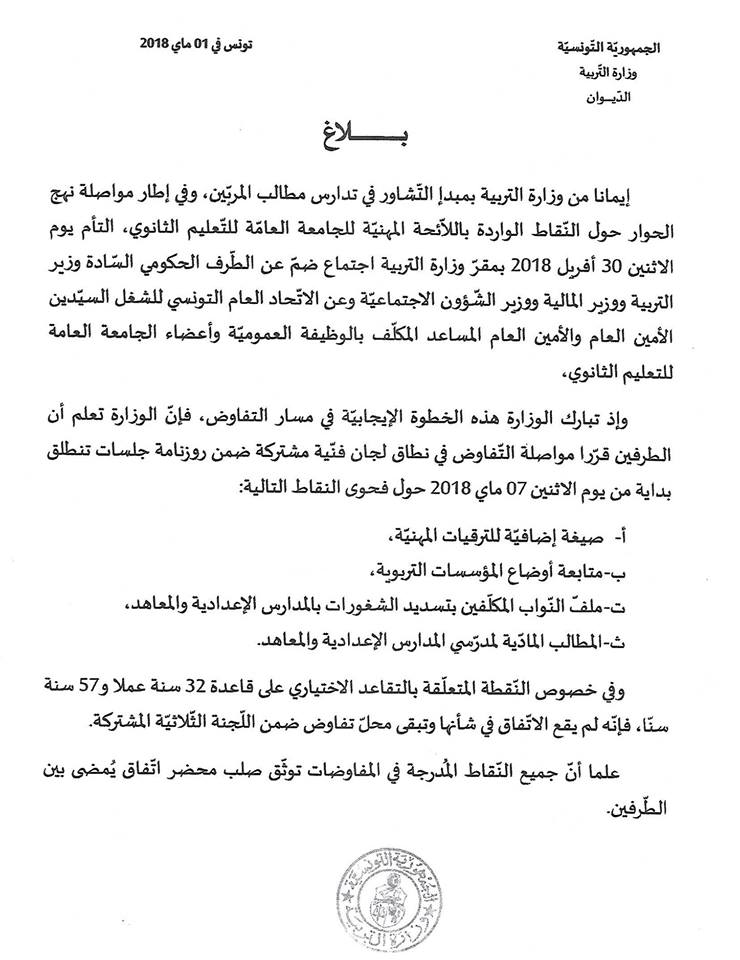 Dans un communiqué rendu public, ce lundi 1er main 2018, le ministère de l’Education a annoncé que suite à une réunion tenue lundi 30 avril 2018 au siège du ministère de l’Education en présence du ministre de l’Education, Hatem Ben Salem et du ministre des Finances, Ridha Chalghoum et celui des Affaires Sociales, Mohamed Trabeslsi, concernant les revendications des enseignants, il a été décidé de poursuivre les négociations.