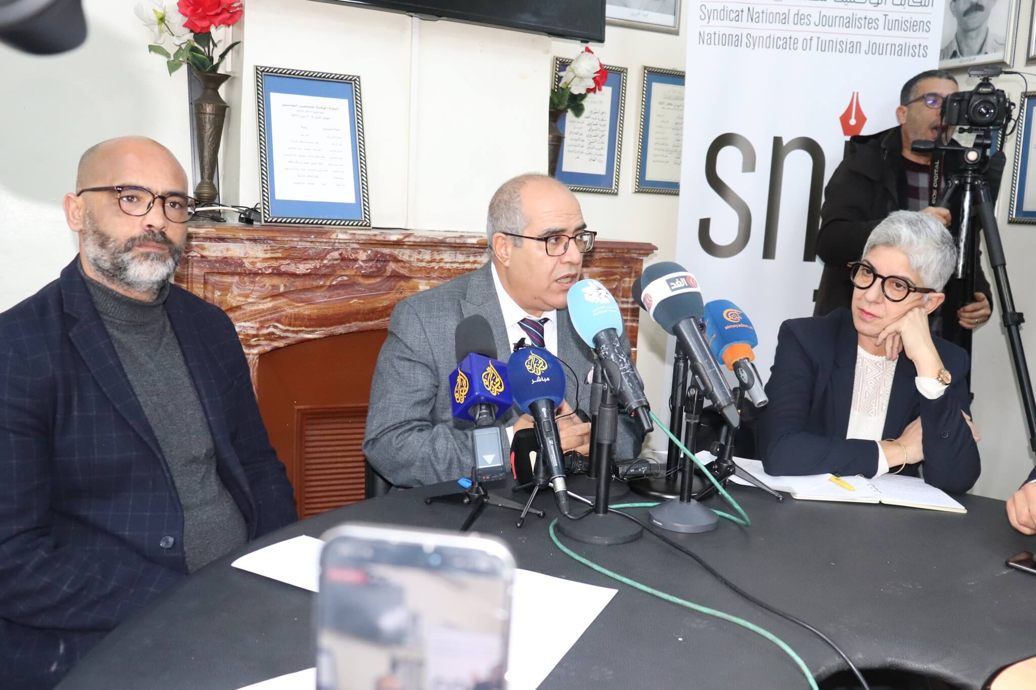 S’exprimant lors d’une déclaration aux médias, le président du Syndicat national des journalistes tunisiens (SNJT), Zied Dabbar, a estimé que la presse tunisienne vit aujourd’hui la période la plus sombre depuis l’indépendance. « Pour la première fois dans l’histoire de la Tunisie, des journalistes se retrouvent derrière les barreaux en vertu du décret 54, a-t-il rappelé, citant notamment Chadha Belhaj Mbarek, Mourad Zghidi, après d’autres précédents comme Khalifa Guesmi, condamné avant qu’un non-lieu ne soit finalement prononcé. « Ce n’est pas une coïncidence, c’est une politique orchestrée », a-t-il affirmé.