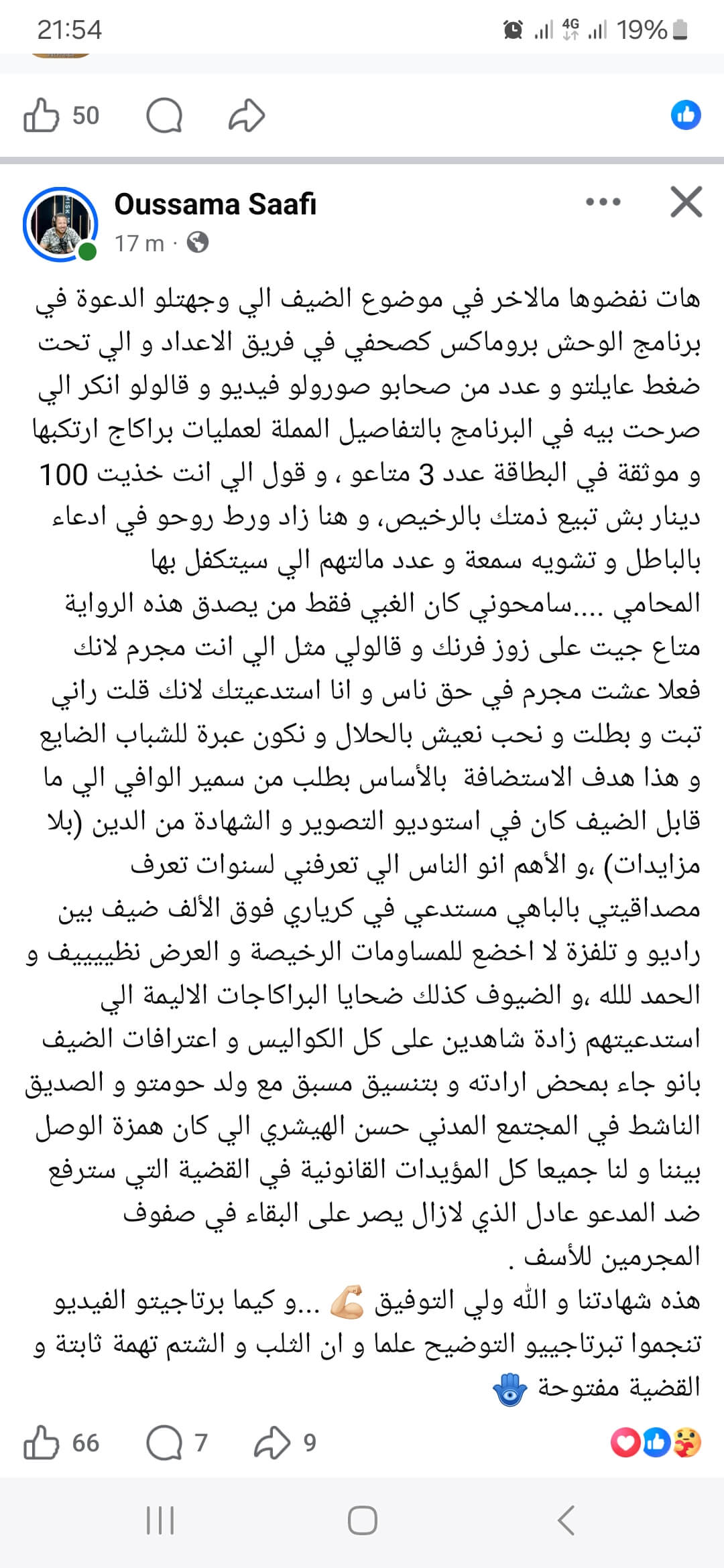 Le journaliste-producteur de l’émission, Oussema Saafi, a également pris la parole pour dénoncer ce qu’il qualifie de « tentative de diffamation » et de « manipulation ». Il précise que l’invité, sous pression de sa famille et de ses proches, a publié une vidéo où il prétend que ses aveux avaient été orchestrés et rémunérés, ce qui est faux selon lui. Saafi insiste sur le fait que l’invité avait affirmé, en toute conscience, vouloir changer de vie et servir d’exemple aux jeunes. Il rappelle également que l’équipe possède toutes les preuves légales et les témoignages de victimes pour étayer la véracité de l’émission et que des procédures judiciaires sont envisagées contre toute diffusion de fausses accusations.