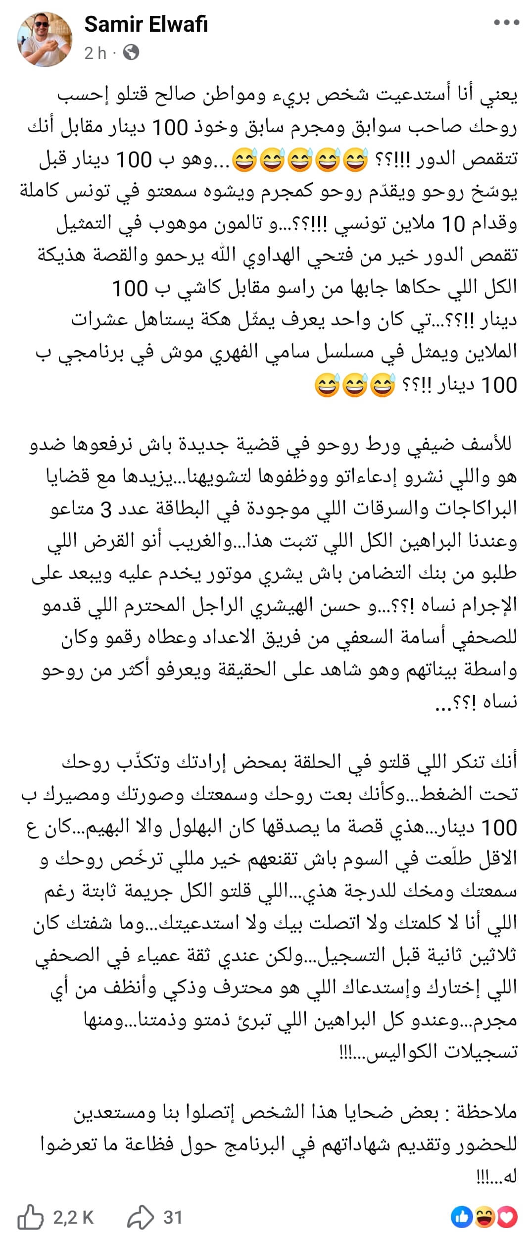 Face à ces déclarations, l’animateur de l’émission, Samir Elwafi, a réagi en publiant un message sur ses réseaux sociaux dans lequel il dément fermement les accusations. Il affirme que l’invité a volontairement terni son image et celle de l’émission, en prétendant avoir été rémunéré pour « interpréter un rôle » et inventer ses aveux. Selon Elwafi, toutes les preuves de la véracité des déclarations d’Adel existent, notamment les enregistrements des coulisses et les dossiers officiels qui corroborent ses aveux, ainsi que les témoignages de plusieurs victimes de braquages. Il souligne que l’invité a agi de sa propre initiative et que l’équipe de production n’a jamais incité quiconque à mentir.