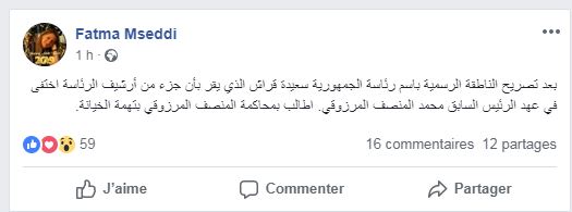 Dans un post publié ce vendredi 04 janvier 2019 sur sa page officielle Facebook, la députée à l’Assemblée des Représentants du Peuple, Fatma Mseddi a appelé à la poursuite judiciaire de l’ancien président provisoire de la République Moncef Marzouki pour trahison, l’accusant d’avoir livré une partie des archives de la Présidence à des parties étrangères. « Après la déclaration de la porte-parole de la Présidence, Saïda Garrach qui confirme la disparition d’une partie des archives de l’institution présidentielle, au temps de l’ex-président Mohamed Moncef Marzouki, je réclame la poursuite judiciaire de Marzouki pour trahison.« a-t-elle écrit.