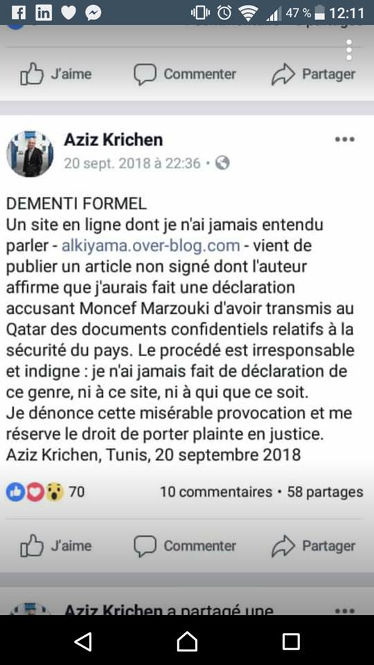 Rappelons que la porte parole de la présidence de la république Saïda Garrach, dans sa réponse à une déclaration de la présidente de l’IVD, Sihem Ben Sedrine, à propos de la disparition d’une partie des archives de l’institution présidentielle, au temps de Marzouki, a souligné que le conseiller de Marzouki, Aziz Krichen, aurait affirmé l’information. Garrach a indiqué que l’archive est remise à l’institut national des archives conformément à la loi. Il est à noter que Aziz Krichen avait déjà réagi à cette polémique en publiant un démenti concernant toute déclaration qui lui aurait été attribuée à propos de la transmission d’une partie des archives de la présidence de la République à des parties étrangères au temps de Marzouki.