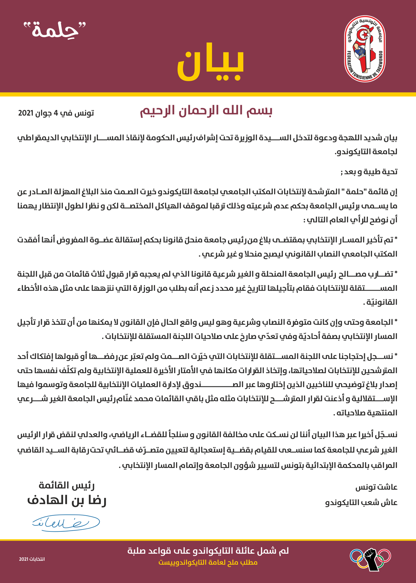 Il semble que de nombreuses irrégularités ont touché les récentes élections au sein de la Fédération Nationale de Taekwondo. Le collectif Helma, présidé par Ridha Ben Hadefh, a appelé le ministère des Sports et de la Jeunesse, ainsi que le Chef du gouvernement, Hichem Mechichi, à intervenir en vue « de sauver le processus démocratique au sein de la Fédération ».