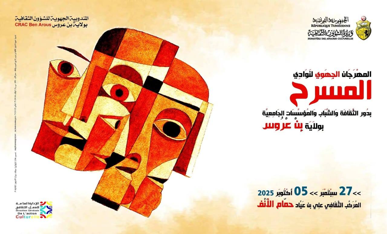 Le Commissariat régional aux affaires culturelles de Ben Arous organise, du 27 septembre au 5 octobre 2025, au Complexe culturel Ali Ben Ayed à Hammam-Lif, le Festival régional de théâtre autour du thème : « Le théâtre, miroir de la société : aborder les phénomènes et comportements à risque ».