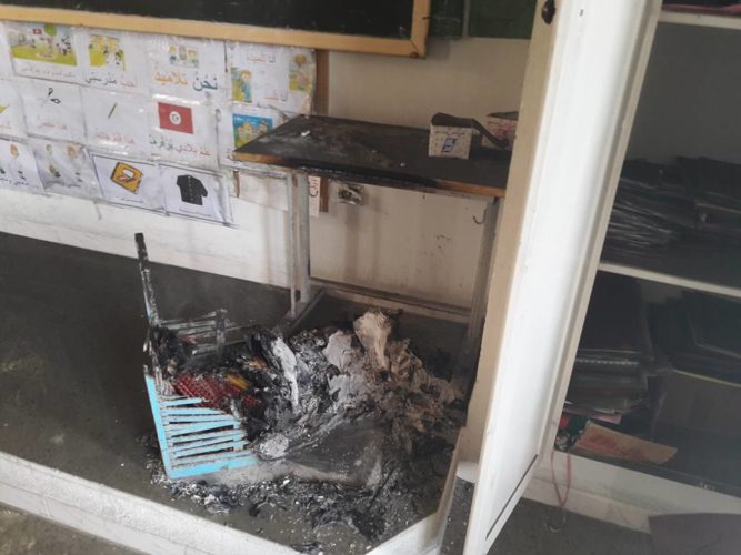Un incendie a été enregistré dans l’une des salles de cours de l’école primaire Al Maarifa dans la localité de Rafraf relevant du gouvernorat de Bizerte ce jeudi 22 février 2018. D’après les premiers éléments, rapportés par Yassine Oueslati, instituteur dans ladite école primaire, un inconnu, aurait réussi à s’infiltrer dans la soirée dans la salle en question. Il aurait forcé l’armoire avant de mettre le feu à l’ensemble des cahiers et documents officiels des enseignants. « La salle était dans un état catastrophique. Les cours ont été suspendus à l’école. Les enseignants ont observé un sit-in de deux heures en signe de protestation contre ces actes de vandalisme. Les élèves étaient traumatisés » a-t-il lancé sur sa page Facebook.