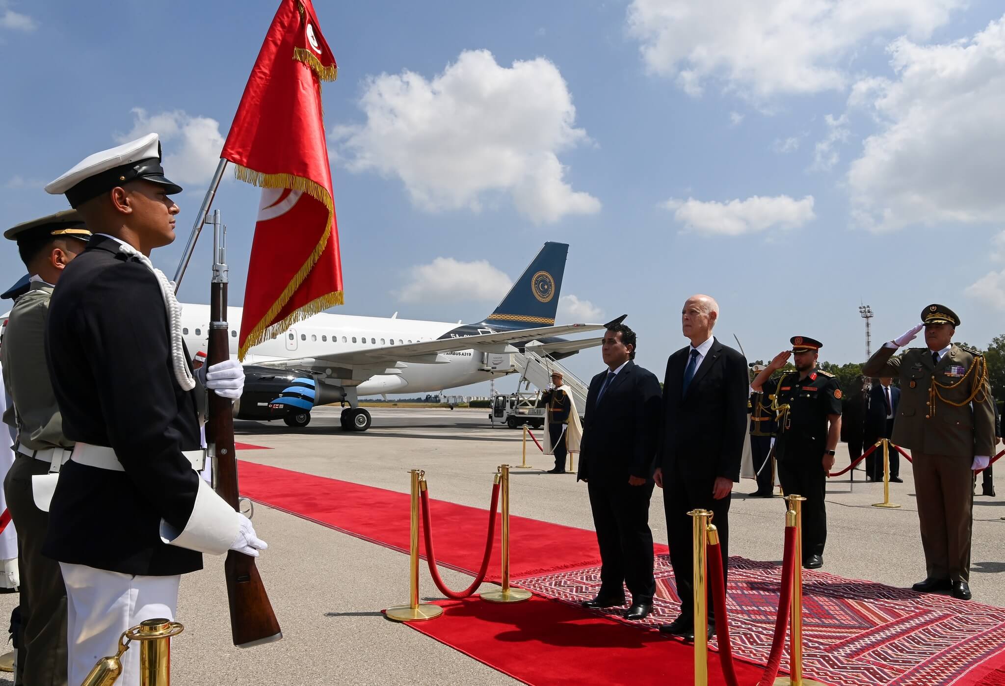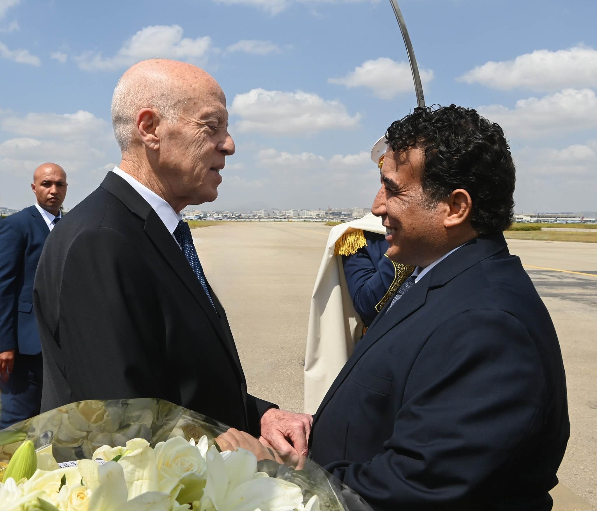 Le président de la République Kaïs Saïed a reçu, le 18 août 2025, le président du Conseil présidentiel libyen, Mohamed Younes Menfi, à l’aéroport de Tunis-Carthage. La visite a débuté par une cérémonie officielle marquée par l’exécution des hymnes nationaux et le passage en revue d’une formation d’honneur des forces armées.