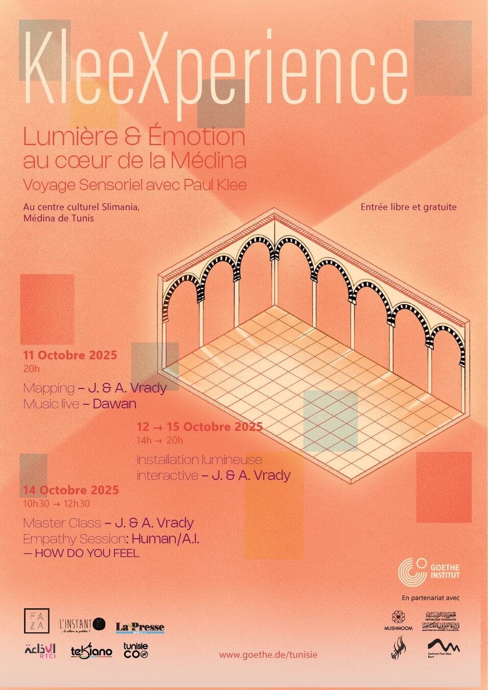 Une exposition, intitulée KleeXperience, se tiendra au Centre Culturel Slimia dans la Médina de Tunis à partir du 11 octobre. Cette création du duo Juliana & Andrey Vrady, organisée par le Goethe-Institut en collaboration avec Mushmoom, le Centre Culturel Slimia et le Zentrum Paul Klee de Berne, célèbre le 111e anniversaire du voyage en Tunisie de l’artiste Paul Klee. L’ensemble du programme est gratuit pour le public.