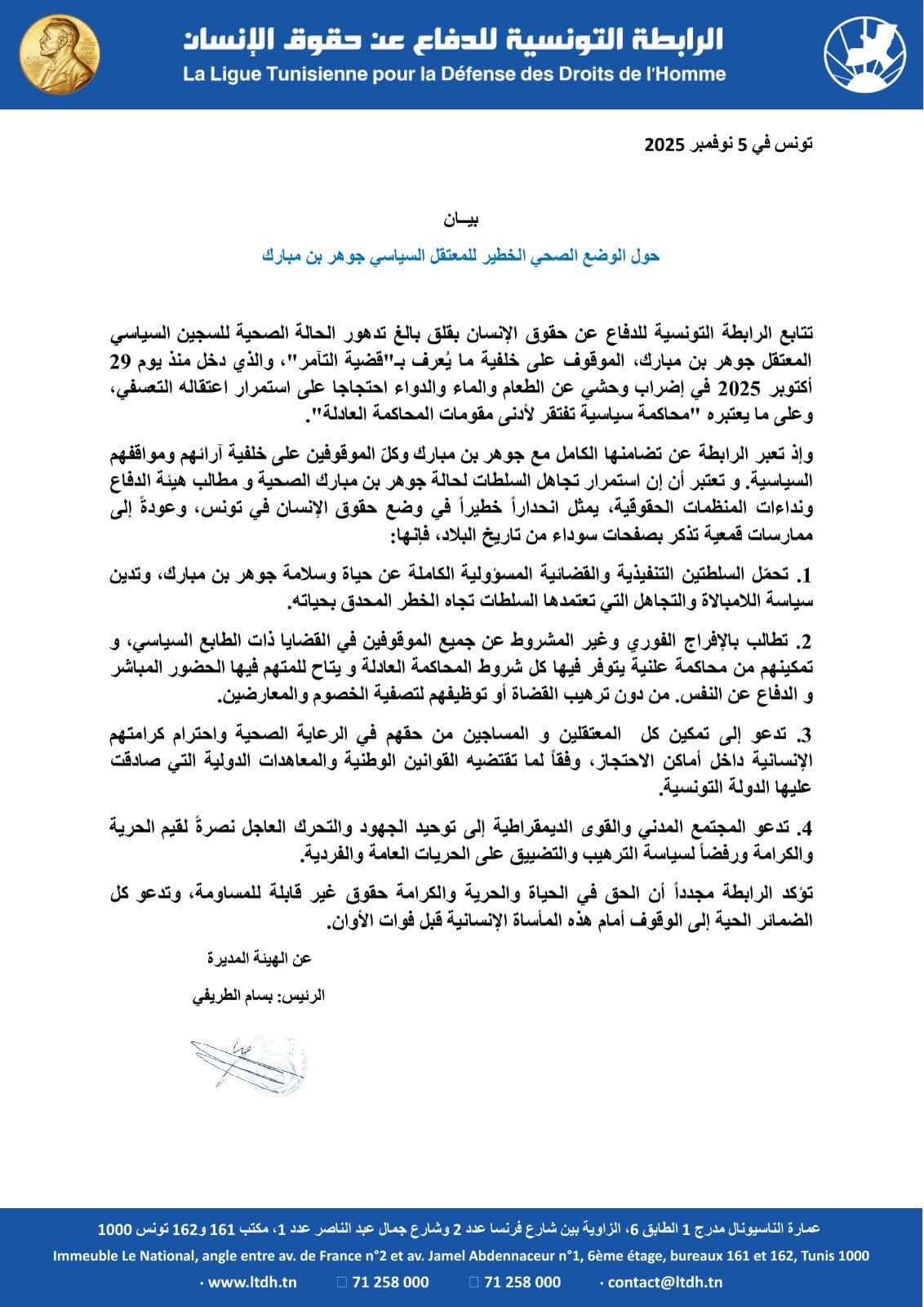 Home Actualités La LTDH tire la sonnette d’alarme sur l’état de santé critique de Jawhar Ben Mbarek