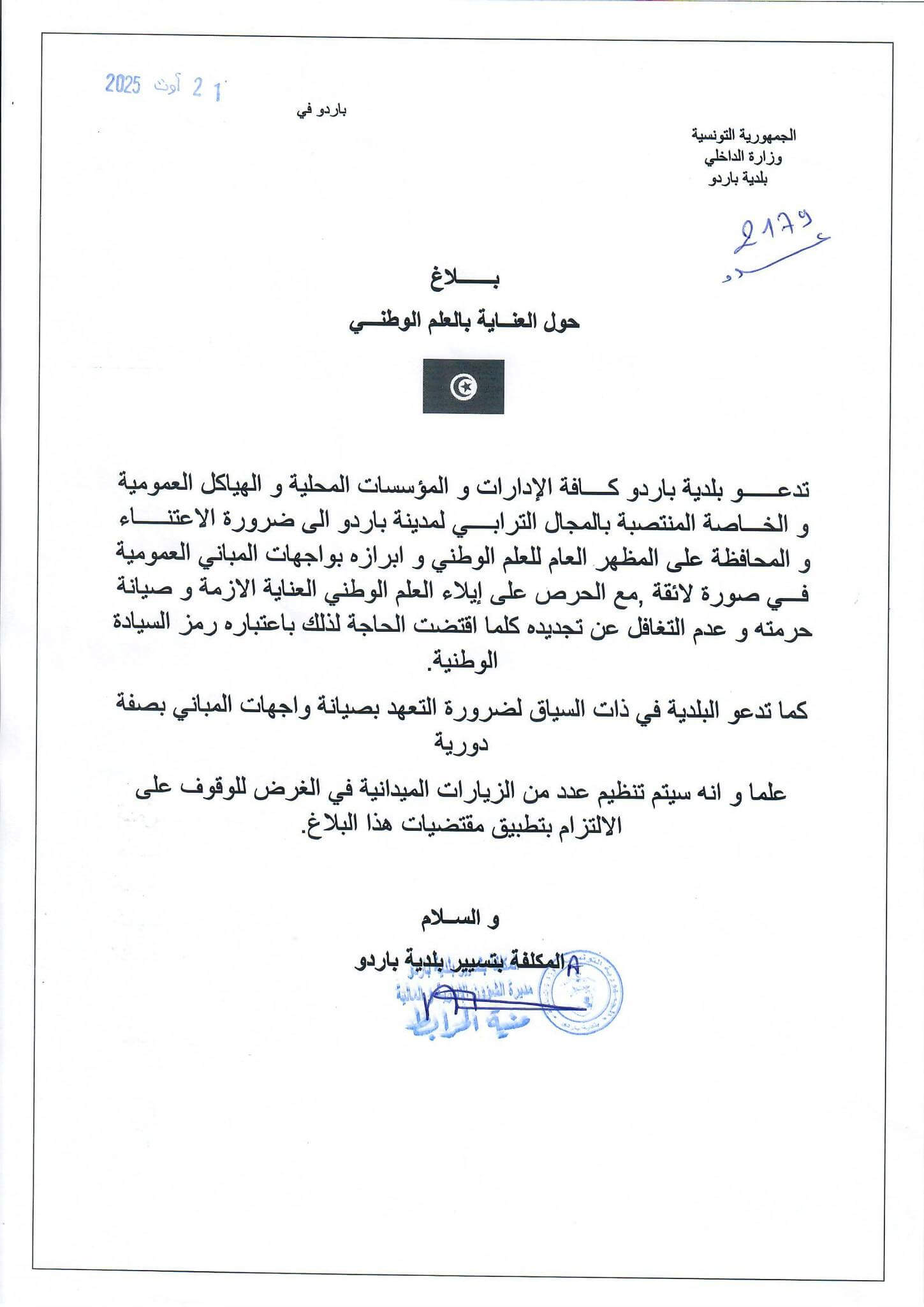 Dans un communiqué publié sur sa page officielle Facebook, la municipalité a insisté sur la nécessité d’afficher le drapeau sur les façades des bâtiments publics dans des conditions dignes, en assurant son entretien, en préservant sa valeur symbolique et en le renouvelant dès que son état l’exige, en tant qu’emblème de la souveraineté nationale.