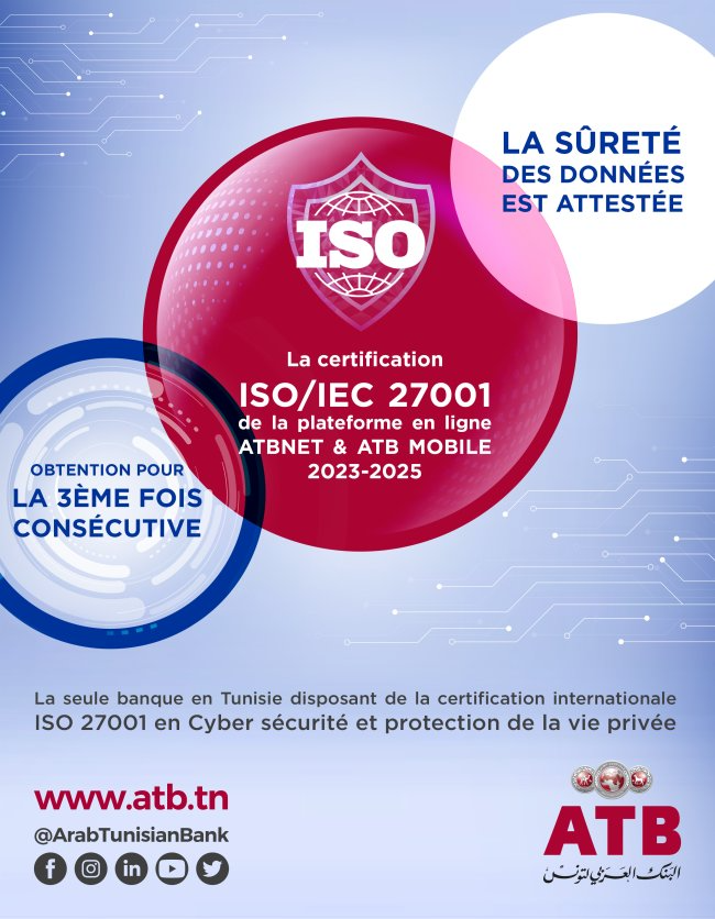 L’ATB, unique banque de la place disposant d’une certification internationale en Cyber sécurité et en protection de la vie privée, signe et confirme encore une fois sa place et son statut de banque leader et pionnière dans l’introduction des nouvelles technologies hautement sécurisées sur le marché bancaire en Tunisie. Il y a lieu de rappeler que l’ATB était, en 2005, la première banque de la place à avoir offert le service d’Internet Banking à sa clientèle.