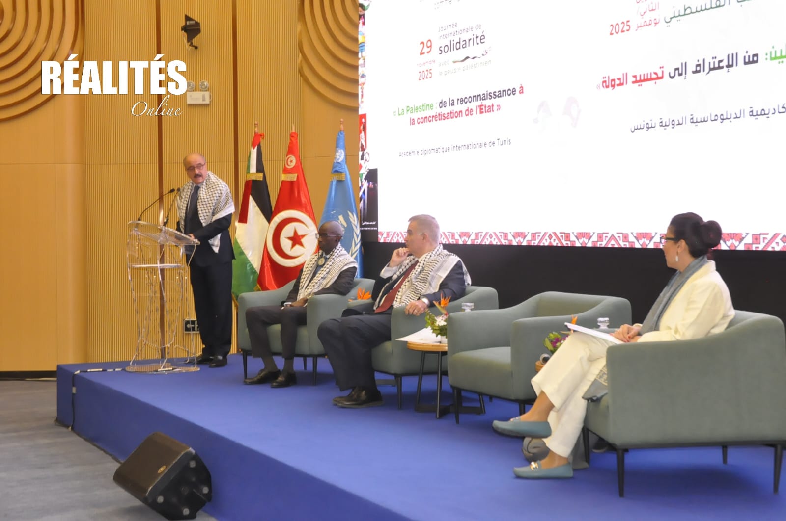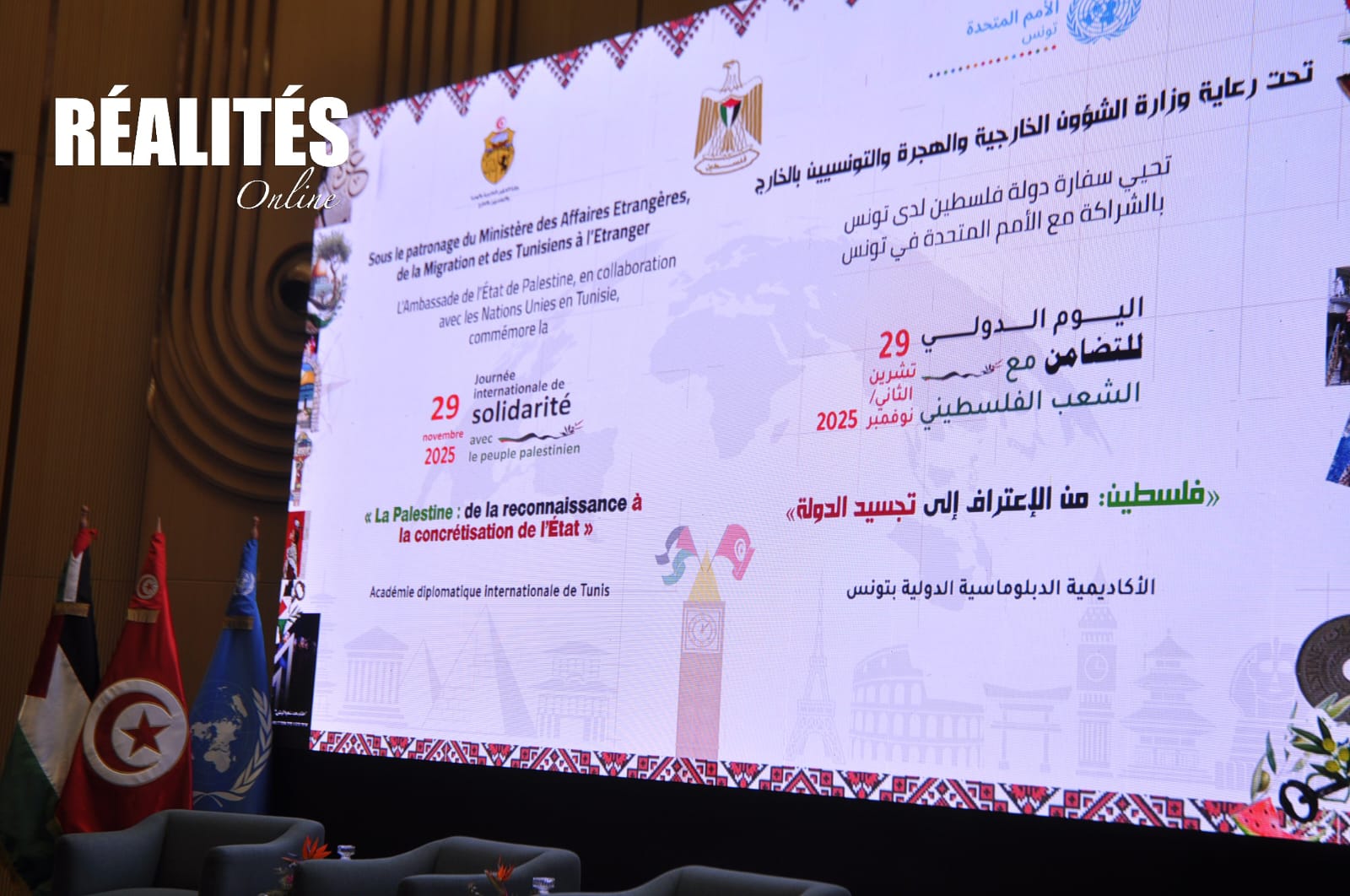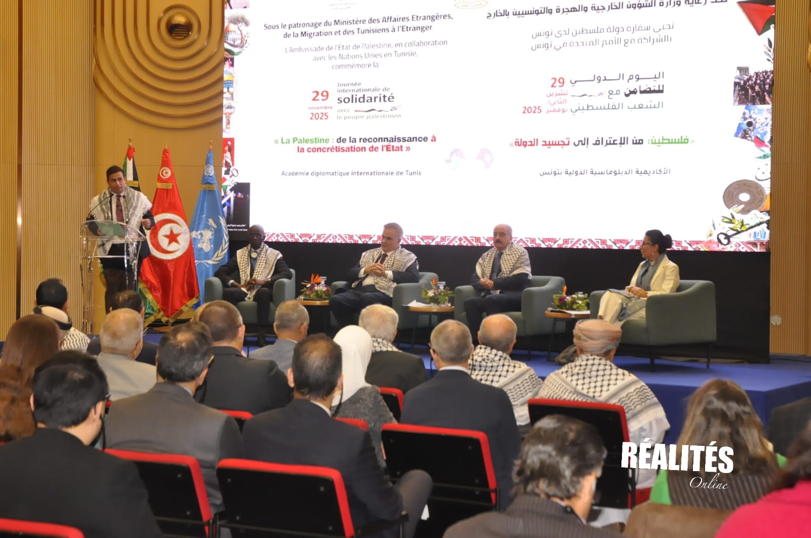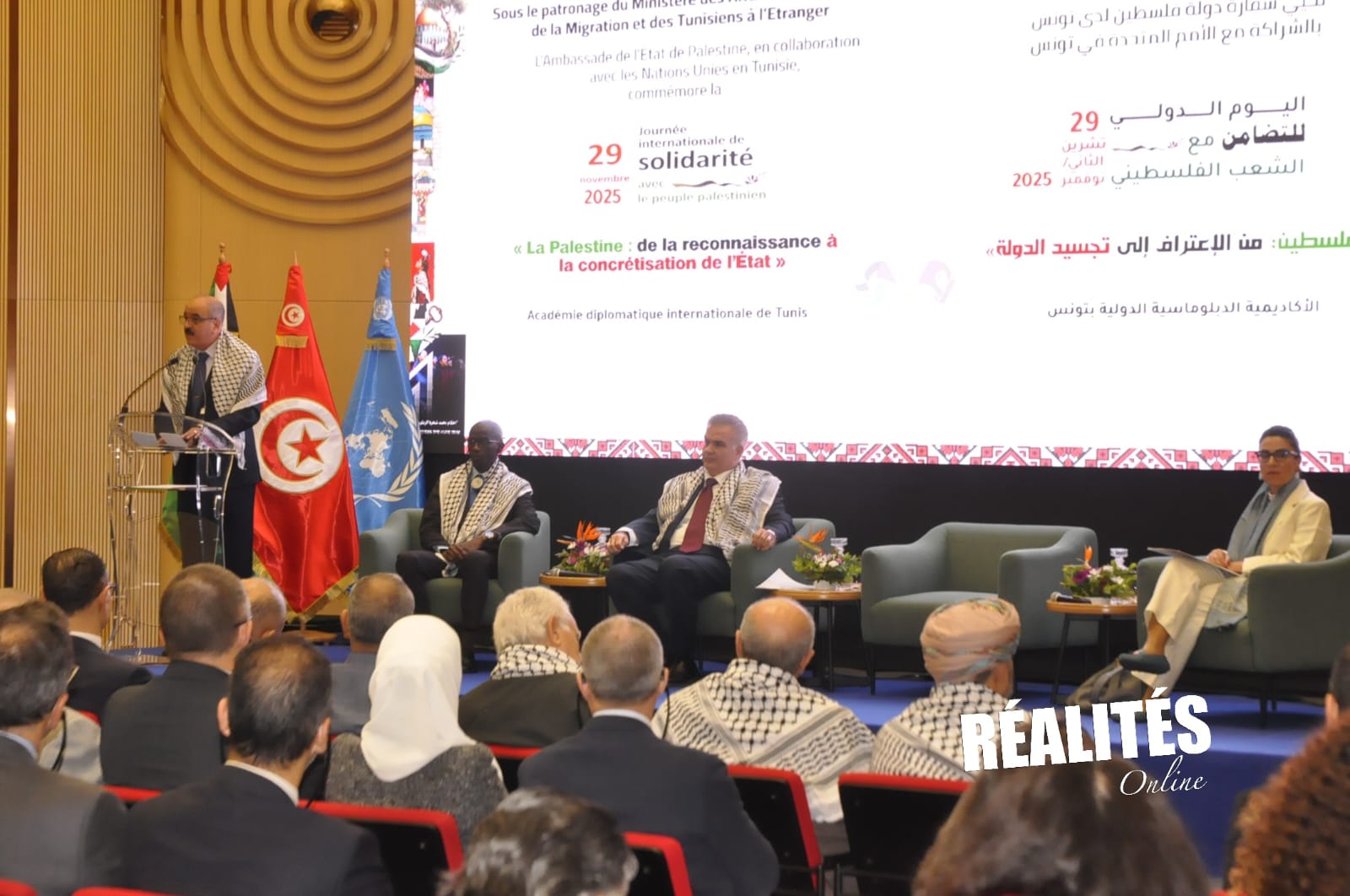 La Tunisie a réitéré, ce samedi 29 novembre 2025, son soutien total, constant et sans condition au peuple palestinien, à l’occasion de la commémoration de la Journée mondiale de solidarité avec le peuple palestinien, organisée à l’Académie diplomatique internationale de Tunis en présence de diplomates, de représentants des Nations unies et de responsables palestiniens.