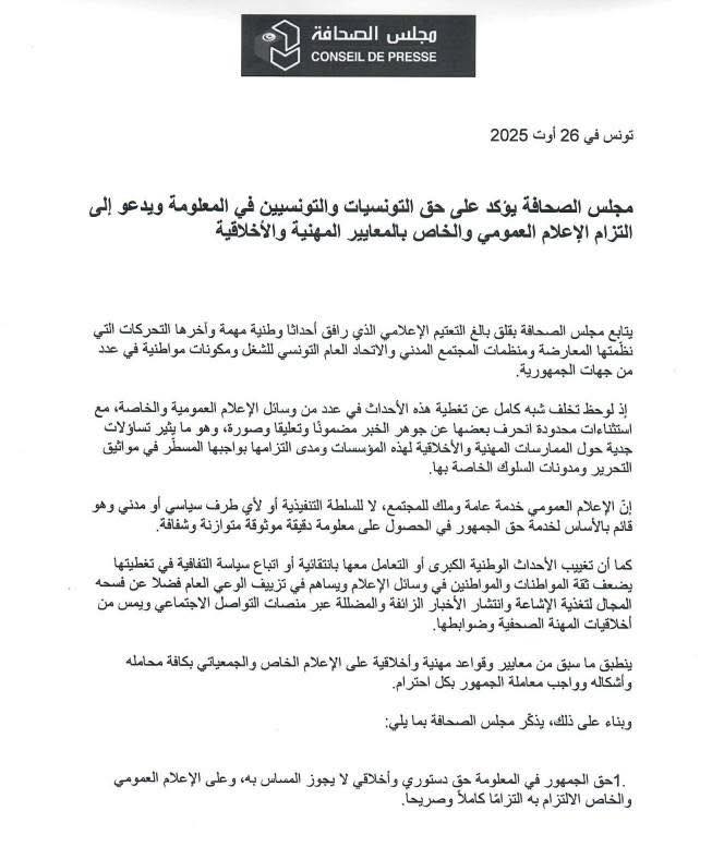 Le Conseil de la Presse a exprimé sa préoccupation face au manque de couverture médiatique de plusieurs événements nationaux récents, notamment les mobilisations organisées par l’opposition, les organisations de la société civile, l’UGTT et d’autres acteurs citoyens dans plusieurs régions de Tunisie.