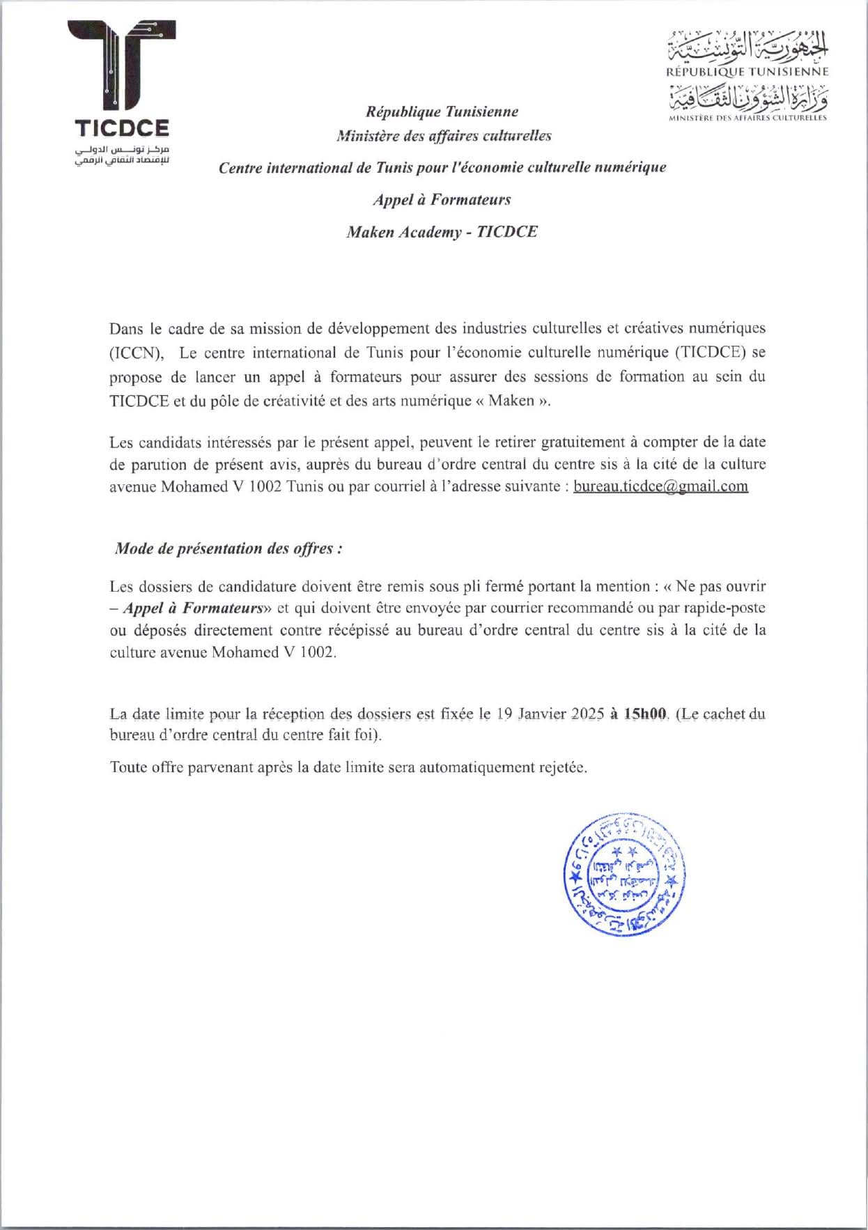 Les personnes intéressées peuvent retirer gratuitement le dossier de candidature dès la publication de cet avis, soit auprès du bureau d’ordre central du Centre, situé à la Cité de la culture, avenue Mohamed V, 1002 Tunis, soit par courrier électronique à l’adresse suivante : bureau.ticdce@gmail.com