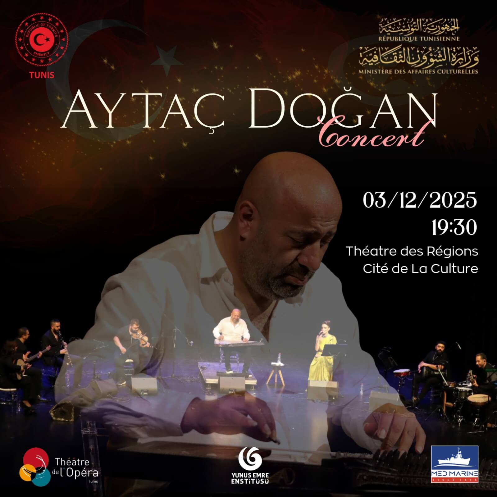 Le célèbre virtuose turc du kanun, Aytaç Doğan, donnera un concert certainement inoubliable le 3 décembre 2025 à la prestigieuse Cité de la Culture de Tunis. Ce concert est organisé sous le patronage de l’ambassade de la République de Türkiye à Tunis, avec le soutien de l’Institut Yunus Emre de Tunis et le parrainage de Med Marine. Il se tiendra en coopération avec le ministère tunisien des Affaires Culturelles.