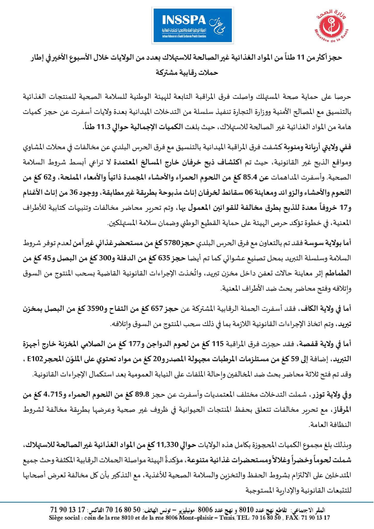 Au total, 11 330 kg de produits alimentaires non conformes ont été saisis à travers les différents gouvernorats concernés.