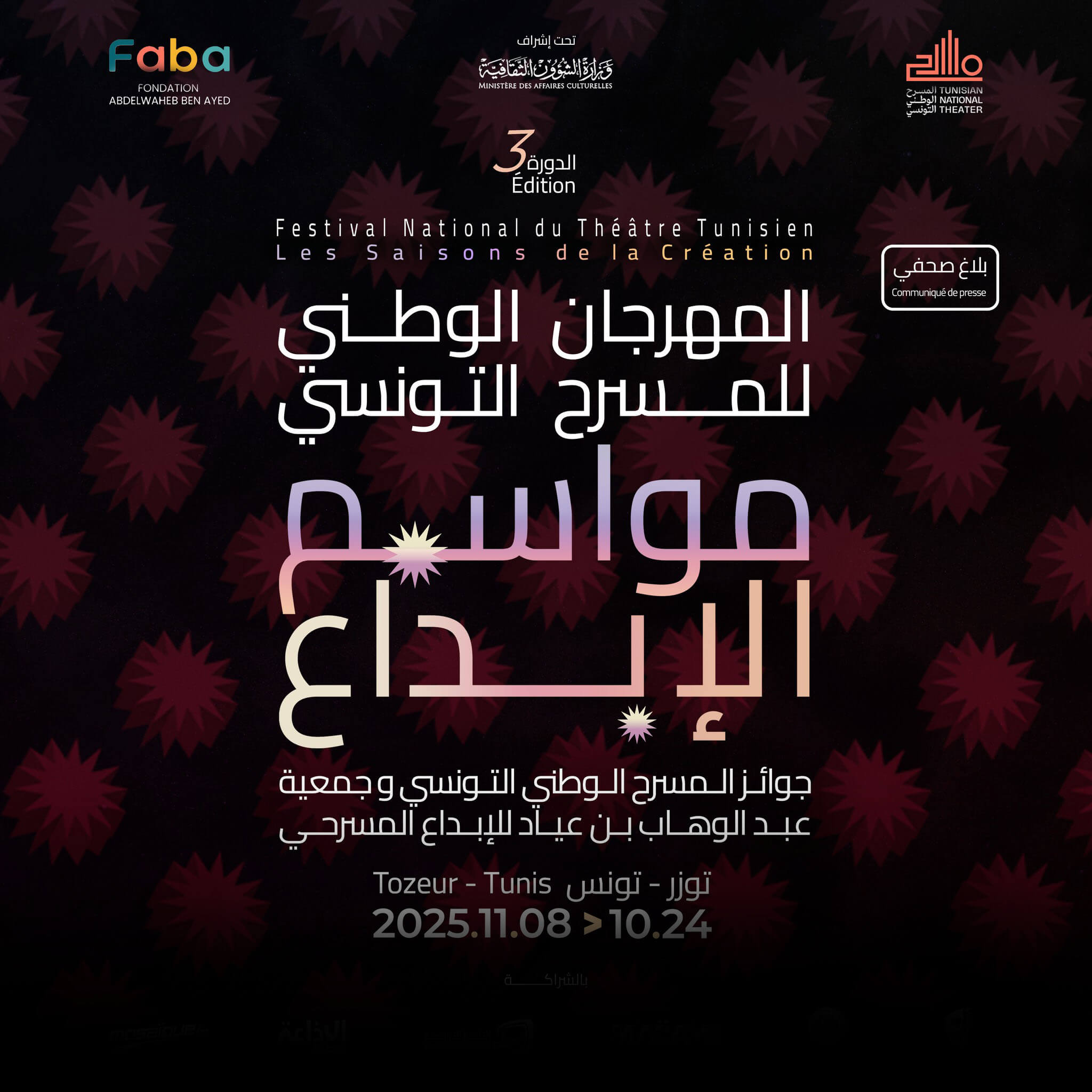 La troisième édition du Festival national du théâtre tunisien “Les Saisons de la création” se tiendra du 24 octobre au 8 novembre 2025 entre Tunis et Tozeur. Cette édition s’ouvre sur une nouvelle dynamique : celle de la décentralisation culturelle et de l’ouverture aux régions.