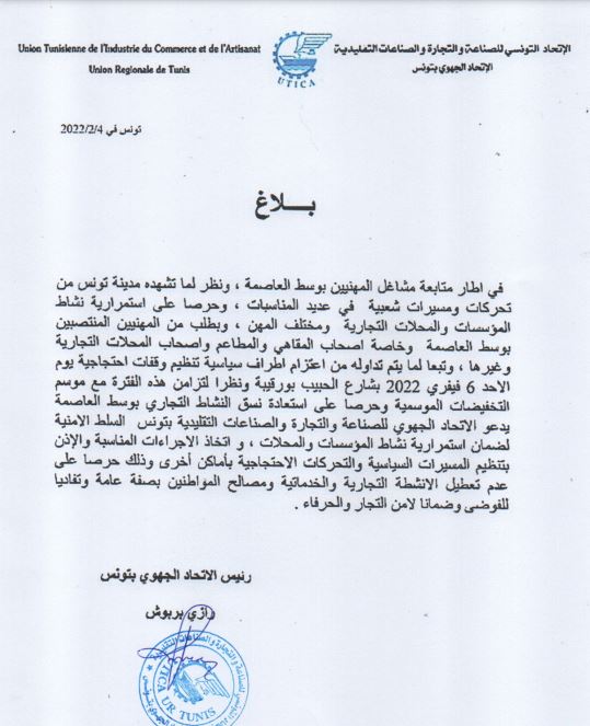 Home A la Une L’UTICA rejette l’organisation de manifestations à l’avenue Bourguiba ce dimanche