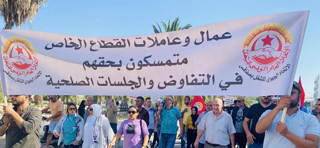 Les cadres syndicaux du secteur privé à Sfax ont organisé, ce jeudi 23 octobre 2025, une manifestation devant les services de l’inspection du travail, accompagnée d’une marche de protestation.