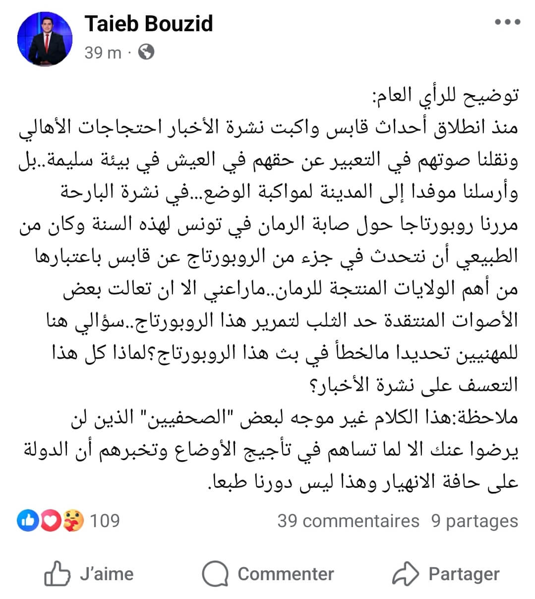 Dans un post publié sur sa page officielle Facebook, Taieb Bouzid, rédacteur en chef du journal télévisé de 20 heures sur la Chaîne nationale 1, est revenu sur les critiques suscitées par la diffusion récente d’un reportage sur la ville de Gabès.