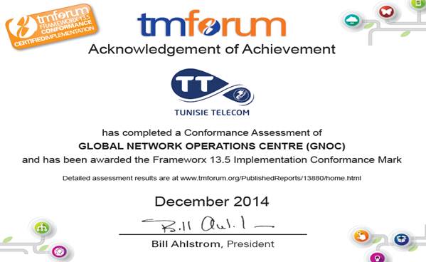 Le Global Network Operations Centre « GNOC » de Tunisie Telecom est certifié conforme au standard Business Processus Framework (eTOM) de TM Forum.