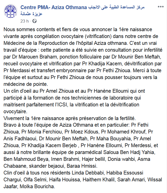 Les médecins tunisiens sont parmi les meilleurs du monde. C’est indiscutable et ils viennent, une fois encore, de le prouver dans le domaine de la procréation médicalement assistée (PMA). Une nouvelle prouesse médicale a été réalisée par le personnel de l’hôpital Aziza Othmana de Tunis, au sein de la section de PMA de l’établissement. Ils sont parvenus, comme peut-on le lire dans un statut Facebook publié sur la page de l’hôpital, à réaliser la première naissance vivante après la congélation ovocytaire, appelé dans le jargon médical « Vitrification ».
