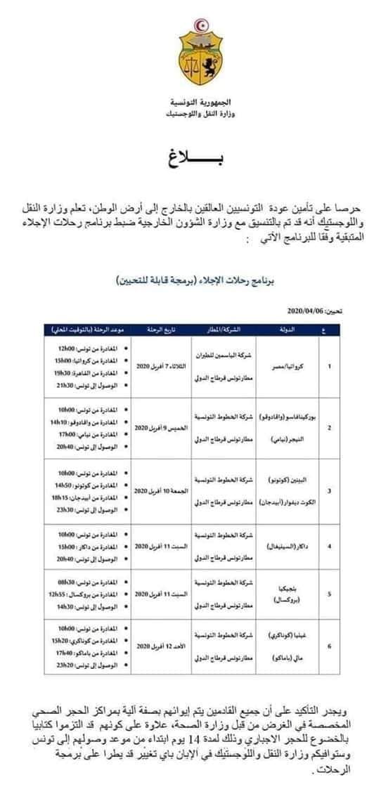 Dans un communiqué rendu public dans la soirée de ce lundi 6 avril 2020, le ministère du Transport et de la Logistique a annoncé la programmation d’une série de vols de rapatriement des ressortissants tunisiens ayant été bloqués à l’étranger. A cet effet, un programme de vols a été mis en place en coordination avec le Ministère des Affaires Etrangères. Ce programme qui pourrait être modifié comme le souligne le communiqué, compte des vols à destination de 10 pays dont 8 pays africains et 2 pays européens. Le transporteur aérien national Tunisair et la compagnie aérienne tunisienne Jasmin Airways assureront ces vols.
