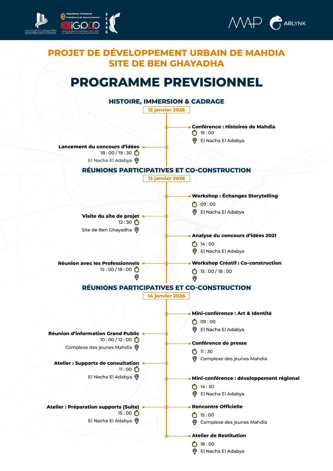 Cette journée clé s’inscrit dans une dynamique plus large initiée les 12 et 13 janvier. La première journée sera consacrée à une conférence sur l’histoire de Mahdia, rappelant ses racines méditerranéennes et fatimides et posant les fondations d’une réflexion sur le développement régional et les grands projets structurants, en intégrant les enjeux environnementaux et climatiques. Le lancement du concours d’idées mobilisera la créativité des citoyens pour définir l’identité visuelle du projet. Le 13 janvier permettra aussi la tenue d’ateliers de storytelling, visites de site, analyse du concours d’idées 2021 et workshops créatifs, donnant aux professionnels, élus et habitants l’occasion de s’exprimer sur les choix urbains et paysagers et garantissant une démarche de co-construction.