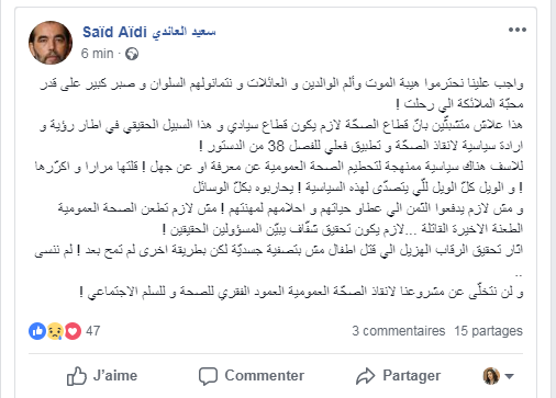 Dans un post publié sur sa page officielle Facebook dans la soirée du samedi 09 mars 2019, l’ex ministre de la santé publique et fondateur du parti Beni Watani, Saïd Aïdi; est revenu sur l’affaire du décès de 11 nouveau-nés à l’hôpital de la Rabta à Tunis pendant les deux derniers jours. Il a dans ce contexte regretté ce drame tout en présentant ses condoléances aux familles sinistrées. « C‘est pour cette raison, que nous nous sommes battus pour que le secteur de la santé, soit un secteur souverain. C’est l’un de nos principaux objectifs dans le cadre d’une vision et d’une volonté politique en vue de sauver le secteur de la santé et d’appliquer effectivement l’article 38 de la constitution tunisienne. Malheureusement, il existe toute une politique orchestrée visant à détruire le système de santé publique. Je l’avais dis à maintes reprises. Ils feront tout pour lutter contre celui qui oserait faire face à cette politique. » a-t-il affirmé.