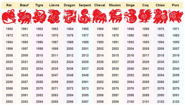 Tous les 12 ans, l’horoscope chinois se renouvelle. Il illustre 12 animaux : Rat, bœuf, tigre, lapin, dragon, serpent, mouton, cheval, singe, coq, chien et cochon. Selon l’histoire, Bouddha avait invité ces 12 animaux de son royaume un soir du Nouvel An et, pour les remercier, il dédia à chacun une année. Donc si vous êtes né sous le signe de tel ou tel animal, vous aurez ses caractéristiques.