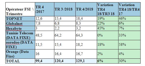 En effet, au 4ème trimestre 2018, Topnet a réalisé une augmentation de 3 Millions DT, soit un taux de croissance de 19%, par rapport au trimestre précédent et de 5,8 Millions DT, soit un taux de 46%par rapport à la même période de 2017 (Tableau indicatif ci-après)