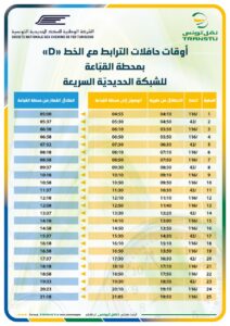 Quant aux horaires, ils ont été établis en coordination entre les deux sociétés, conformément à la programmation des trains de la ligne D du RFR (Tunis – El Gobbaâ), afin d’assurer des correspondances fluides entre bus et train.