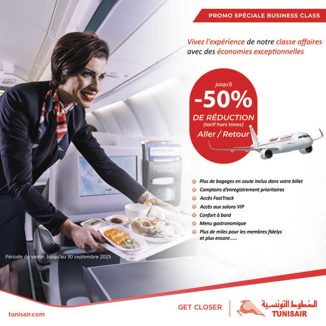 Home Actualités Tunisair lance une offre exceptionnelle en Classe Affaires : jusqu’à 50 % de réduction